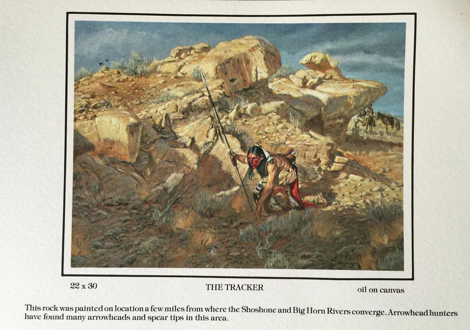 I came across this card of a painting I did a long time ago. I painted the rocks on location south of Byron, Wyoming. I met my model when we were both young men. I was scouting good painting ideas at a Mountain Man Rendezvous in the Big Horn Mountains. There were quite a few tipis but one was one in particular looked very authentic. There was a paint pony with and Indian saddle. That is where I met 19 year old Mike Terry from South Carolina. He said his parents both had Indian blood in them and that made him have a desire to articulate his heritage in a real way.